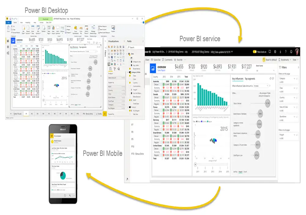 Power BI چیزی شبیه به یک چتر است و می تواند در یک برنامه دسکتاپ ویندوز به نام Power BI Desktop، یک سرویس آنلاین SaaS به نام Power BI Service و یا برنامه های Power BI موبایل که در ویندوز تلفن های همراه و تبلت ها موجود است، مورد استفاده قرار بگیرد.