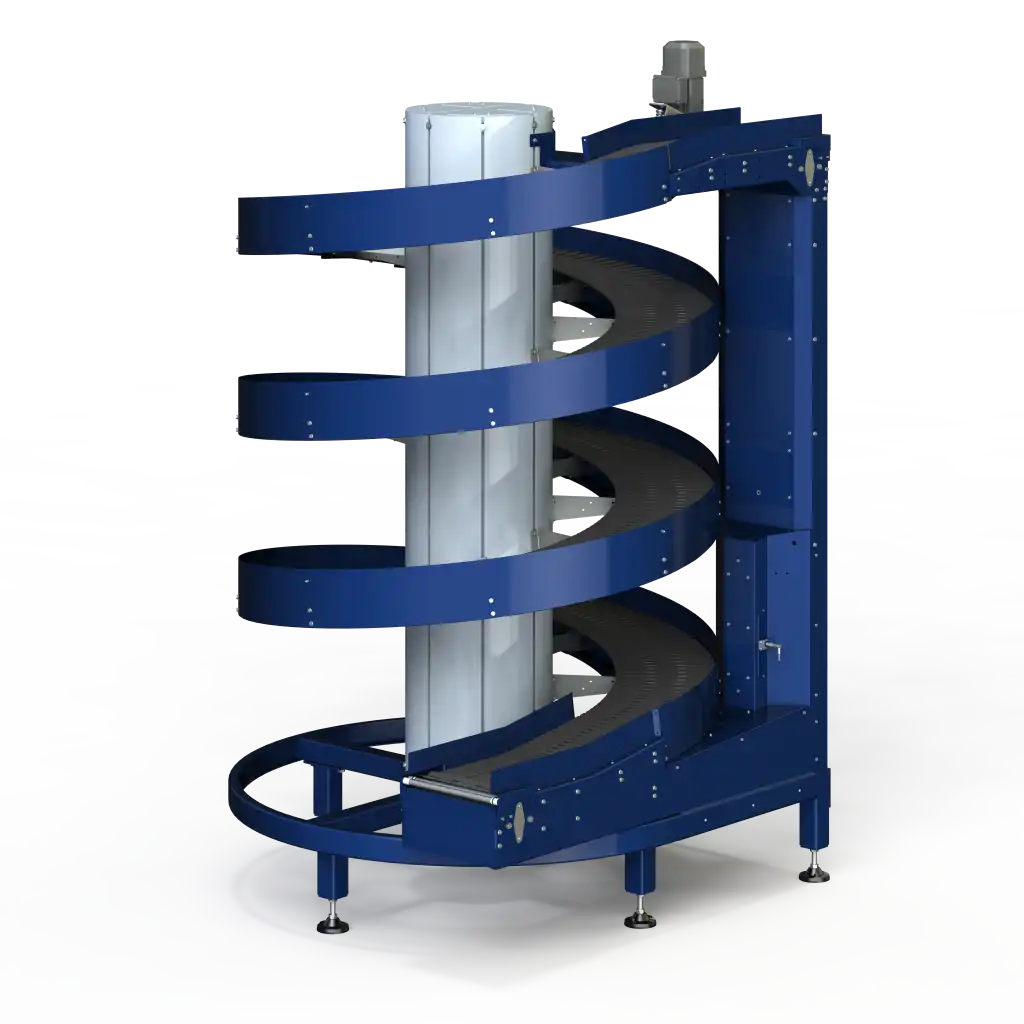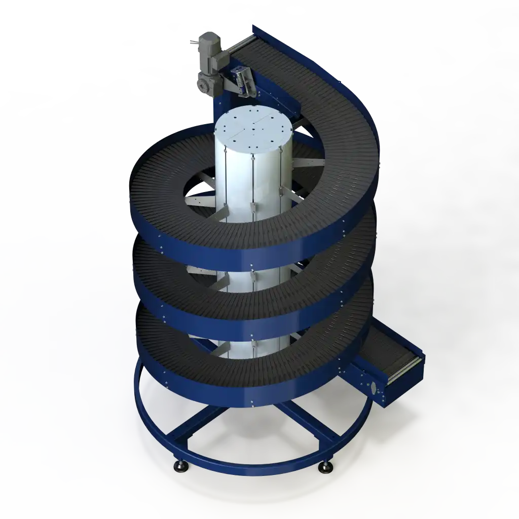 این نوع کانوایرها برای انتقال کالاها بین طبقات به شکلی جمع و جور و بدون نیاز به فضای زیاد استفاده میشوند. کانوایرهای مارپیچی معمولاً در فضاهای محدود که نیاز به استفاده بهینه از فضای عمودی وجود دارد، به کار میروند و کالاها را بهصورت مارپیچی بین طبقات مختلف حرکت میدهند.