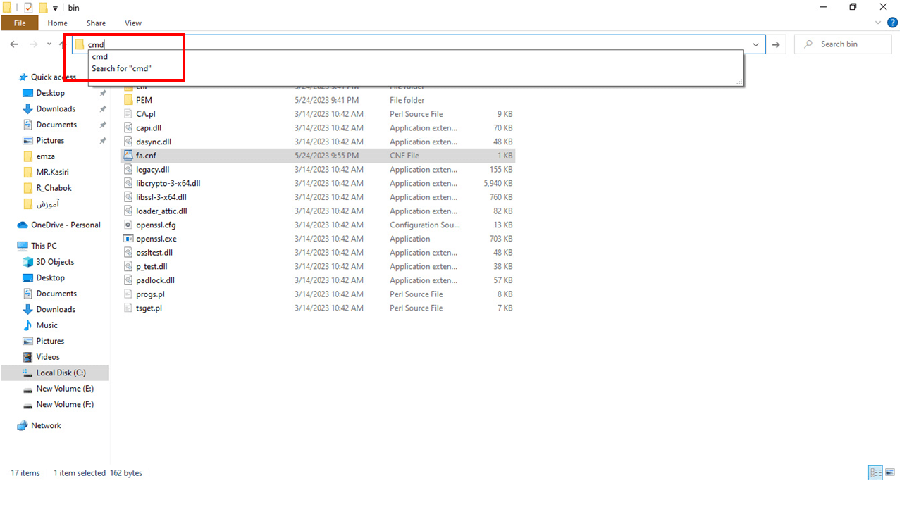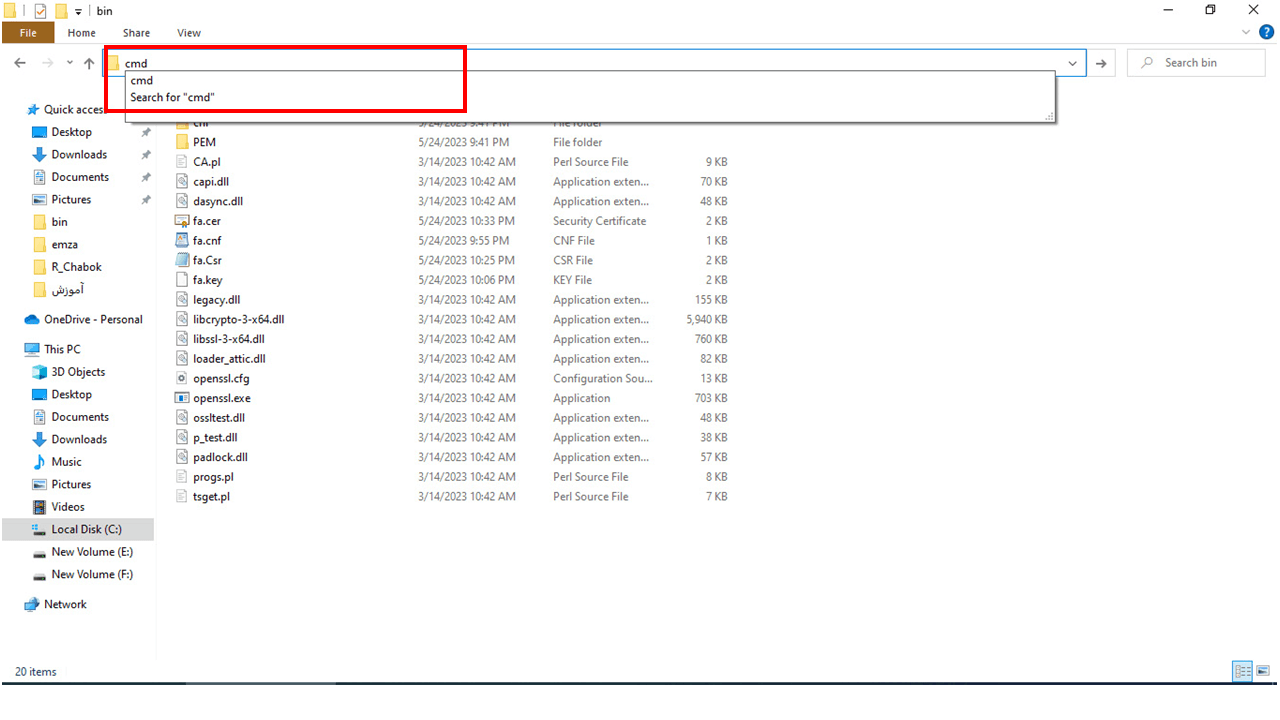 36- در مسیر نصب فایل Open ssl بر روی نوار جستجوی بالای صفحه کلیک کرده و مجددا Cmd را تاپ کنید و Enter بزنید