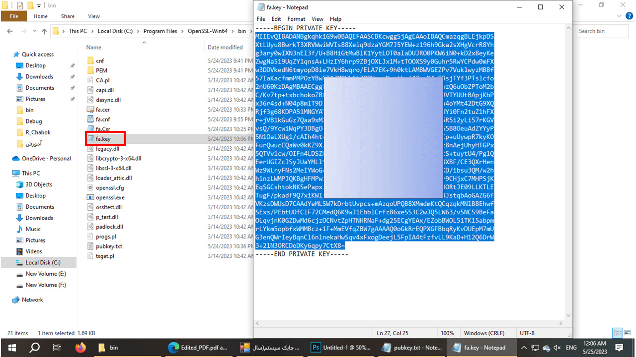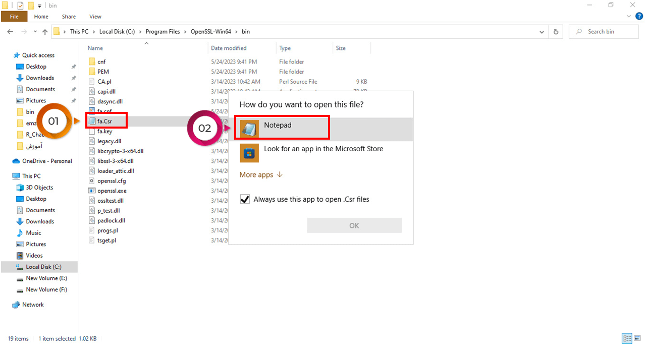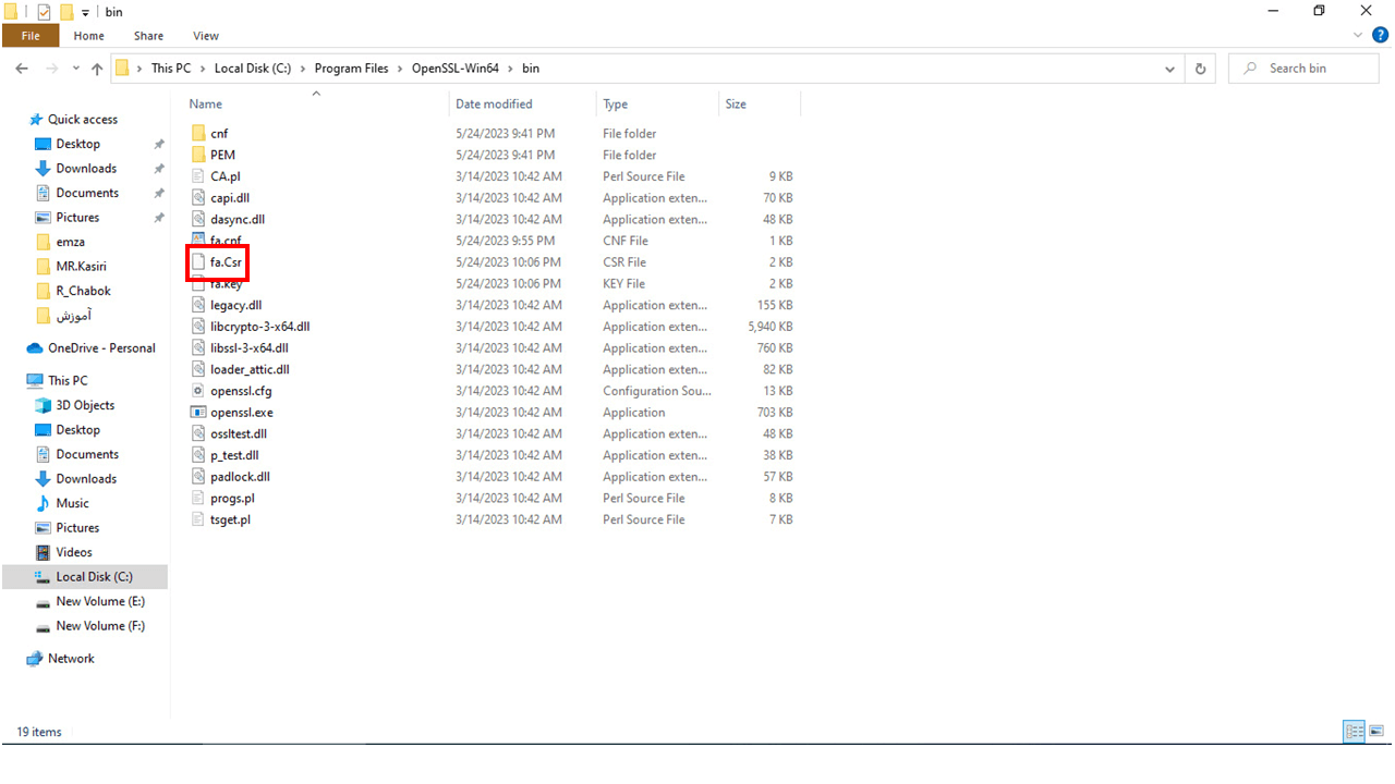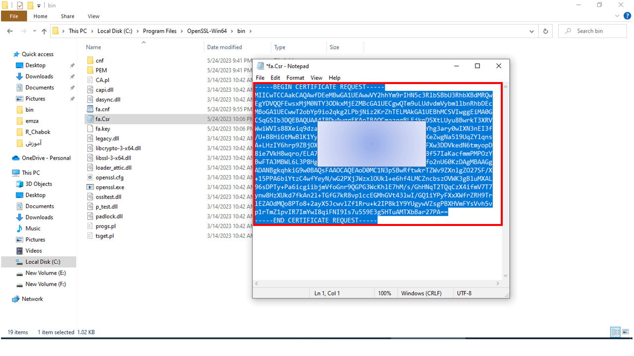 21- در این مرحله وارد مسیر نصب Open ssl شده و فایل fa.Csr را به وسیله برنامه Notepad باز کنید