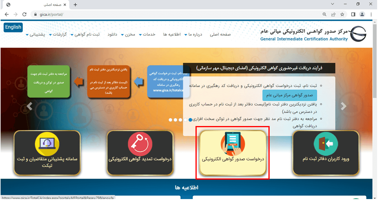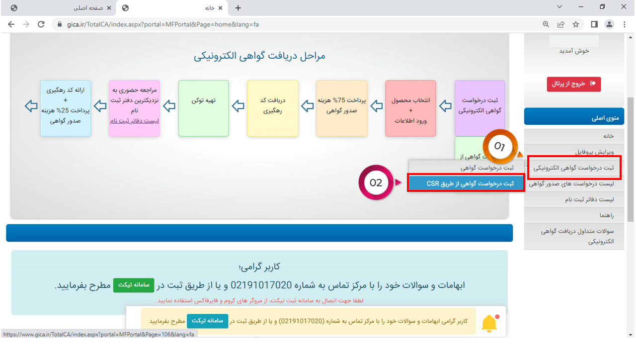 20 – در این مرحله بر روی دکمه ثبت درخواست گواهی الکترونیکی و بعد از آن بر روی گزینه ثبت درخواست گواهی از طریق CSR کلیک کنید