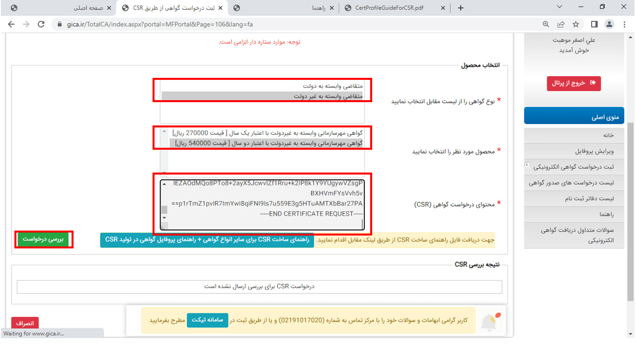 23- مطابق با تصویر زیر اطلاعات خواسته شده پر شود و در قسمت محتوای درخواست گواهی(CSR) متن کپی شده در مرحله قبل جایگذاری شود و بر روی بررسی درخواست کلیک کنید