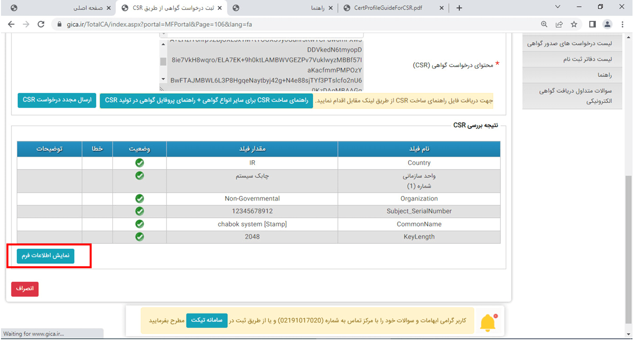 24- بعد از آن اگر اطلاعات وارد شده صحیح وارد شده بود بر روی نمایش اطلاعات فرم کلیک کنید