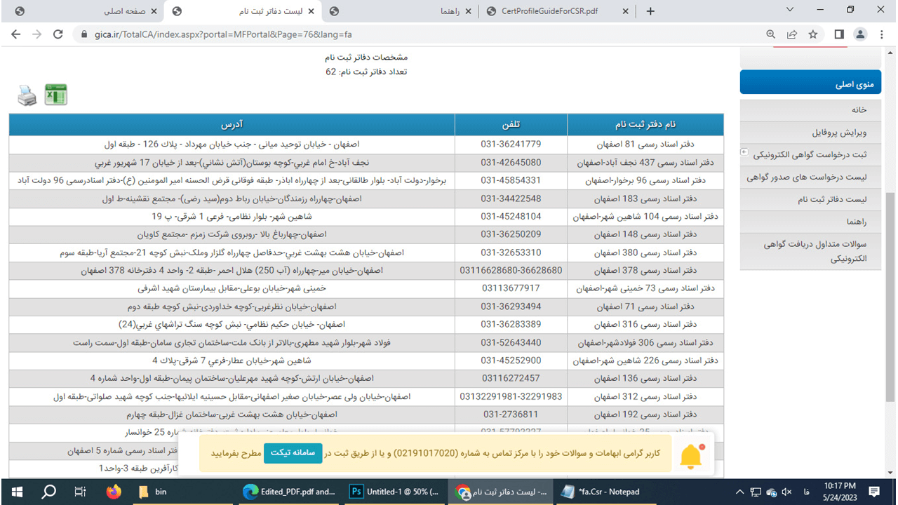 26- در این مرحله پس پرداخت و زدن دکمه ثبت درخواست در مرحله قبل وارد صفحه معرفی دفاتر ثبت نام می شود .که باید جهت ثبت اطلاعات به نزدیک ترین دفتر مراجعه کنیدو مدارک خواسته شده شامل