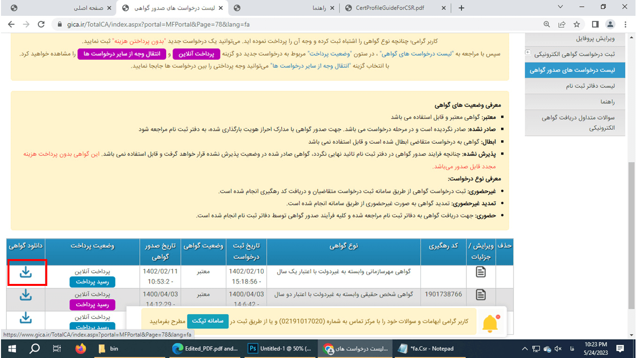 27- پس از آنکه به دفاتر بالا مراجعه شد و مدارک تایید شد مجددا به سایت برگشته و این بار بر روی دکمه لیست درخواست های صدور گواهی کلیک کنید تا پنجره گواهی ها باز شود