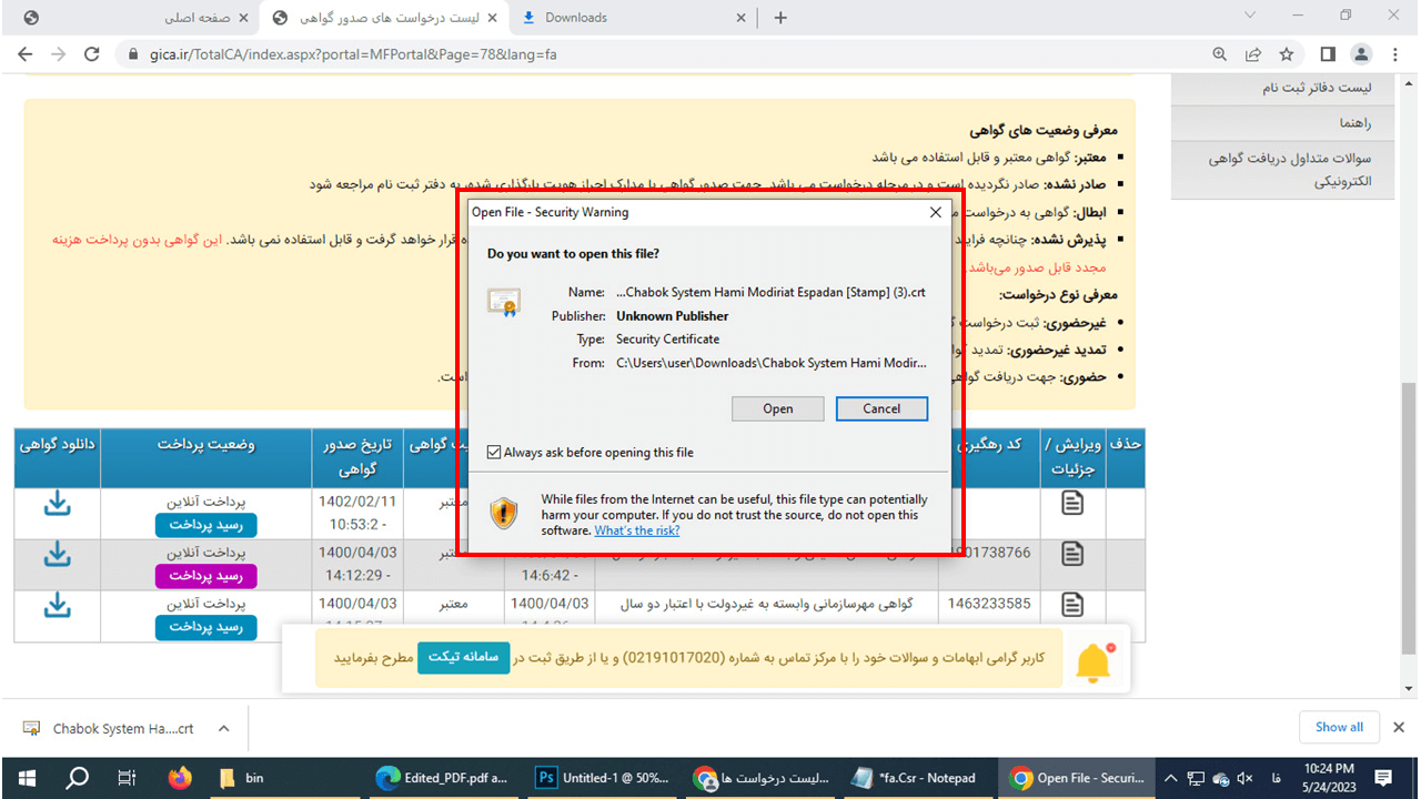 در این مرحله بر روی دانلود گواهی کلیک کنید