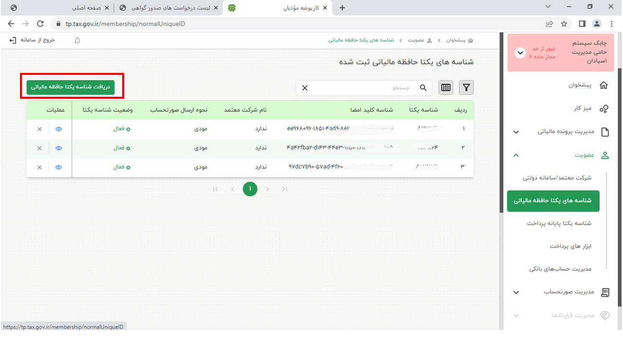 42-بر روی دکمه دریافت شناسه یکتا حافظه مالیاتی کلیک کنید