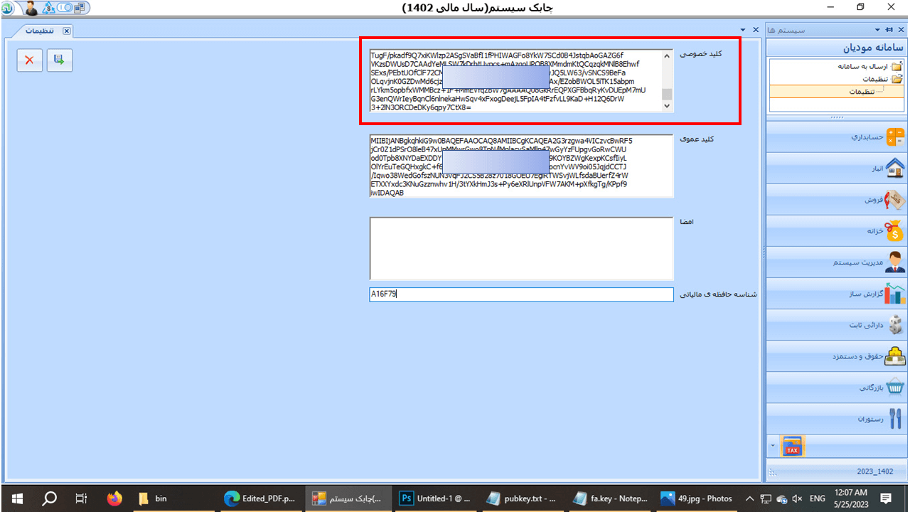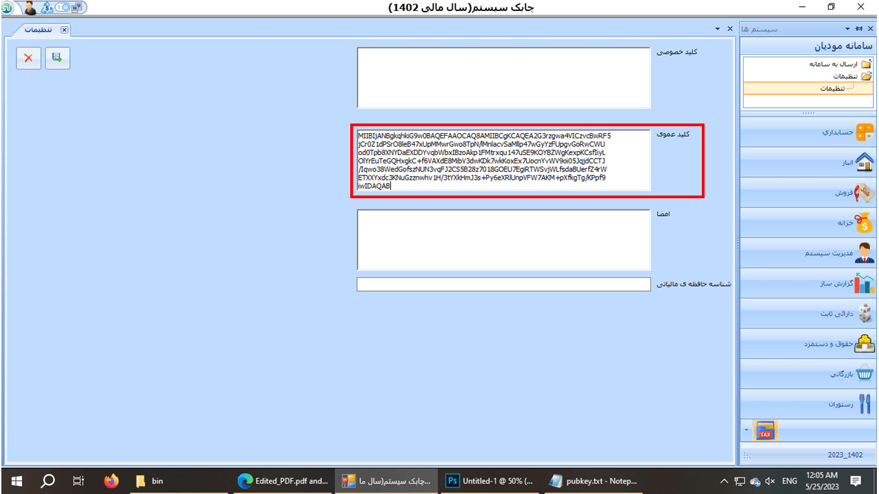 53- وارد نرم افزار چابک سیستم شده و ماژول سامانه مودیان را انتخاب کرده و ووارد گزینه تنظیمات شوید و فایل کپی شده در مرحله قبل را در قسمت کلید عمومی قرار دهید