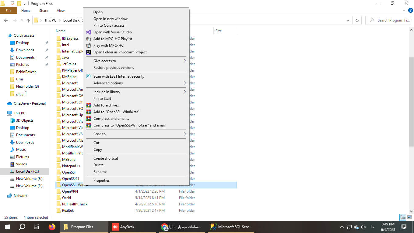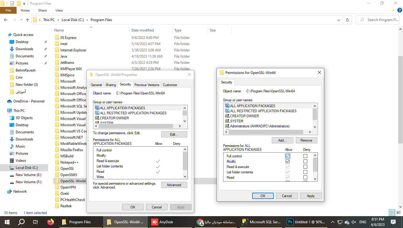 ابتدا به مسیر نصب نرم افزار open ssl رفته و بر روی پوشه open ssl کلیک راست نمایید و پنجره properties را باز کنید